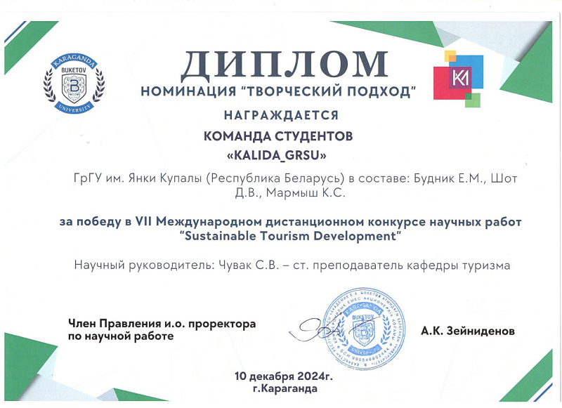 It has already become a tradition for Kupala students to participate in the International Distance Competition of Scientific Papers "Sustainable Tourism Development", which was held for the seventh time by the Marketing Department and the Institute for the Study of the Digital Economy of the Karaganda University named after Academician E.A. Buketov.