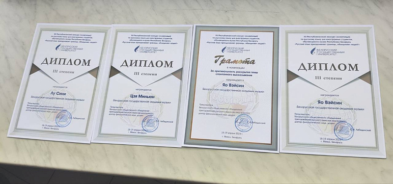 On April 18-19, the XII Republican Olympiad in the Russian language for foreign students studying at universities of the Republic of Belarus was held at the Belarusian State University. The students of the preparatory department of the Belarusian State Academy of Music Jia Mianyang, Lu Xin, Yao Feixin were awarded diplomas of the 3rd degree, the listener Yao Weixin was awarded a diploma!