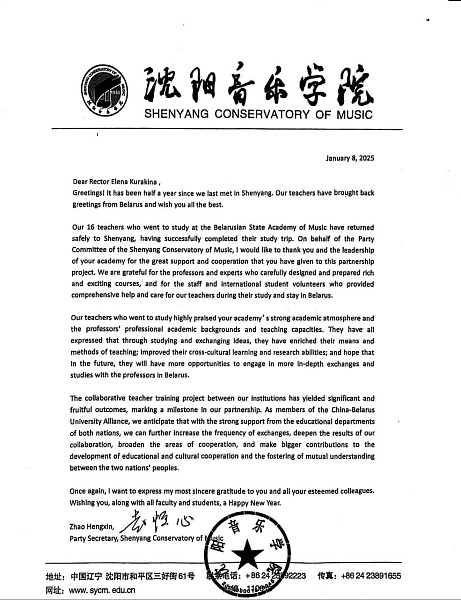 Rector of the Belarusian State Academy of Music, Candidate of Art History, Associate Professor E.V.Kurakina received a letter of thanks from the leadership of the Shenyang Conservatory of Music for their assistance in preparing and conducting an educational internship program at the academy. 16 foreign colleagues from China highly appreciated the professional achievements and experience of the academic staff of the Academy. This project, which was organized within the framework of the Chinese-Belarusian Association of Universities, is an important part of the development of educational and cultural cooperation, as well as strengthening relations between China and Belarus.