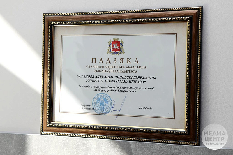 "Vitebsk State University named after P.M. Masherov" was awarded a Letter of Gratitude from the Chairman of the Vitebsk Regional Executive Committee Alexander Subbotin "For active participation in organizing and holding events of the XI Forum of Regions of Belarus and Russia".