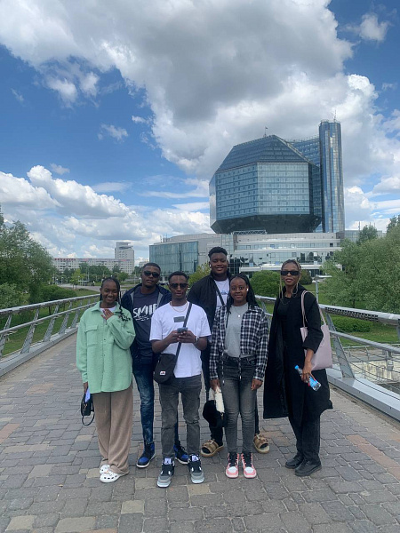 17 мая слушатели Подготовительного отделения БНТУ из Зимбабве посетили Национальную библиотеку Республики Беларусь совместно со специалистом Факультета международного сотрудничества Ногач Анной Михайловной. Со слушателями подготовительного отделения было проведено информационно-образовательное мероприятие «Национальная библиотека как кладезь знаний и достижение современной белорусской архитектуры». Информационно-образовательное мероприятие началось с обзорной экскурсии по территории библиотеки, в ходе которой они познакомились с особенностями ее архитектурного и художественного оформления, с читальными залами, справочно-информационной функцией библиотеки, а также системой заказа и доставки книг. Во время экскурсии по библиотеке студенты сделали на память фотографии на фоне интересных достопримечательностей.