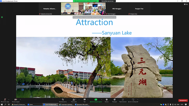 Presentations were made by the students of Economics and Finance Faculty, specializing in linguistic support of intercultural communications (foreign economic relations) Alesya Vasinkevich, Mark Demianchuk, Vladislav Sukharevich and other students of Polessky State University. Speakers from Yantai University were students of the Faculty of Foreign Languages CAO Mengfei, WAN Jintao, SHAO Zichuan, Liu Chu and others. The total number of participants was about 40.