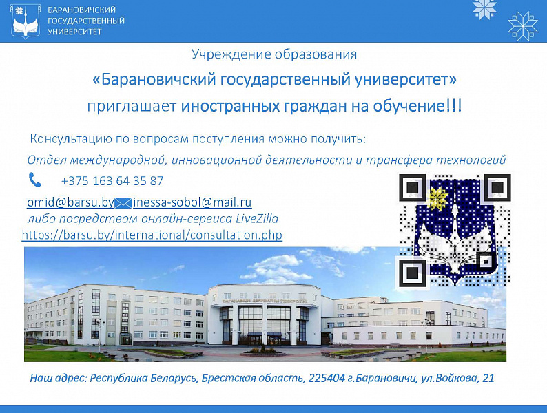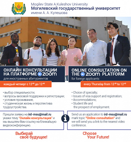 Within the framework of online consultations, foreign citizens will be able to find out detailed information about universities, admission rules, information about specialties and tuition prices, the procedure for issuing invitations to study at the university, issuing a Belarusian visa, passing a medical examination on the territory of the Republic of Belarus, the procedure for settling in dormitories, and information about the Republic of Belarus.