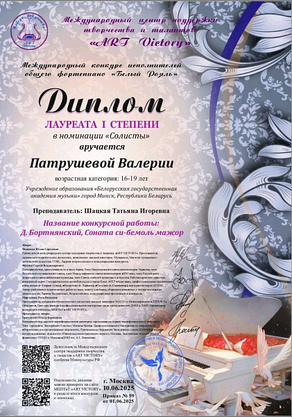 Valeria Patrusheva, a 1st-year student of the Belarusian State Academy of Music, became a 1st degree laureate in the Soloists category, age category 16-19 years (class of Associate Professor T.I.Shatskaya).
