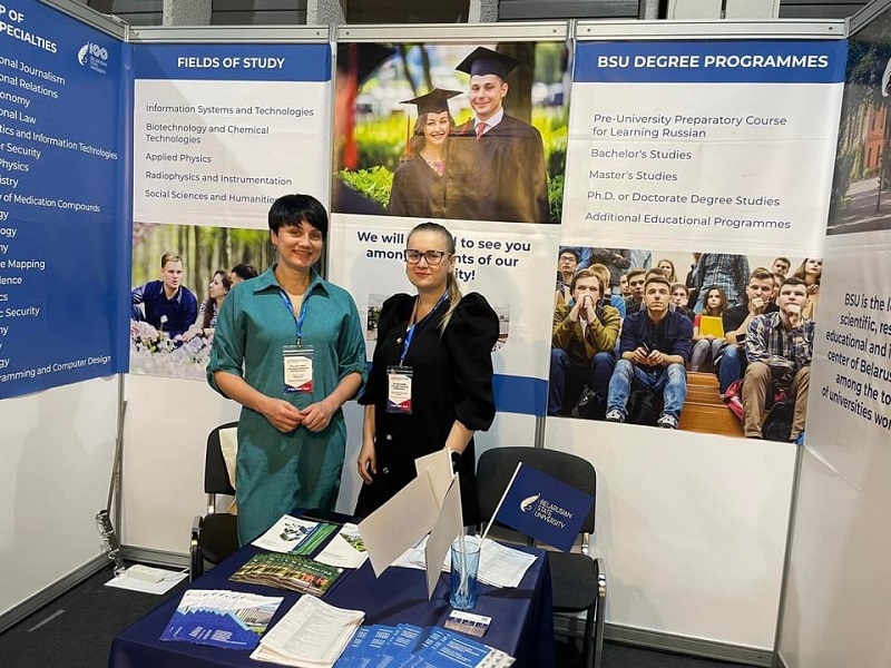 На стенде БГУ представлена информация о деятельности факультетов и институтов, правилах приема, стоимости обучения, а также о профориентационных мероприятиях и подготовительных курсах для абитуриентов. Программа выставки включает беседы с казахской молодежью. Также ребятам помогают сориентироваться по специальностям университета c учетом интересов и предпочтений школьников.