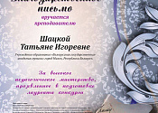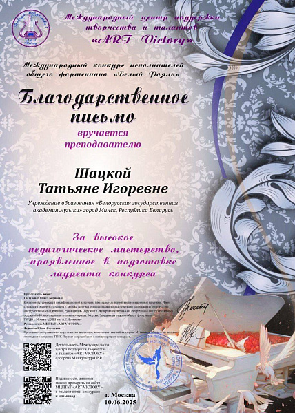 Татьяна Игоревна Шацкая получила Благодарственное письмо "За высокое педагогическое мастерство, проявленное в подготовке лауреата конкурса".