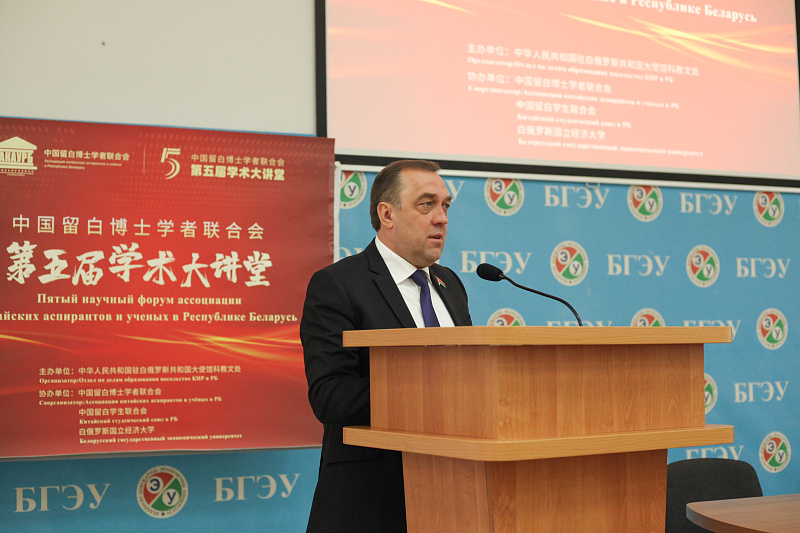 В настоящее время в Республике Беларусь обучается 572 китайских аспиранта. Ассоциация китайских аспирантов и ученых в Республике Беларусь была создана в апреле 2018 года. Эта инициатива была направлена на повышение интенсивности академического обмена между китайскими и белорусскими аспирантами и экспертами в различных областях, на развитие китайско-белорусских отношений и углубленное сотрудничество. И сегодня к участникам научного форума с приветственным словом обратился господин Цзя Вэй: «Прежде всего, разрешите мне от имени Посольства Китайской Народной Республики в Республике Беларусь выразить нашу благодарность Белорусскому государственному экономическому университету за активную поддержку в организации форума и за позитивный вклад в развитие образования между Республикой Беларусь и Китайской Народной Республикой. Я верю, что этот форум привнесет особую академическую атмосферу и вдохнет новую жизнь в образовательный обмен между нашими странами. Я также верю, что ваше время обучения и практики в этой прекрасной стране обязательно пойдет на пользу и на всю жизнь останется бесконечным впечатлением». После господина Цзя Вэя слово для приветствия гостей взял ректор БГЭУ Алексей Егоров: «Дорогие друзья, коллеги! Вы все являетесь представителями большой корпорации ученых. Университеты всегда были академическими подспорьями для научных базисов. От нас с вами зависит не только развитие техники, медицины, но и политических систем наших стран. Минуло время, когда мы говорили, что учеба — это конечный процесс овладения знаниями. Теперь мы понимаем, что для того, чтобы быть конкурентоспособными – надо обучаться всю жизнь. Сегодня мы даем специалистам навык исследовательской работы. Мне приятно принимать в стенах нашего университета элиту китайского общества. Я хочу вам пожелать успехов в углублении знаний о ваших будущих профессиях».