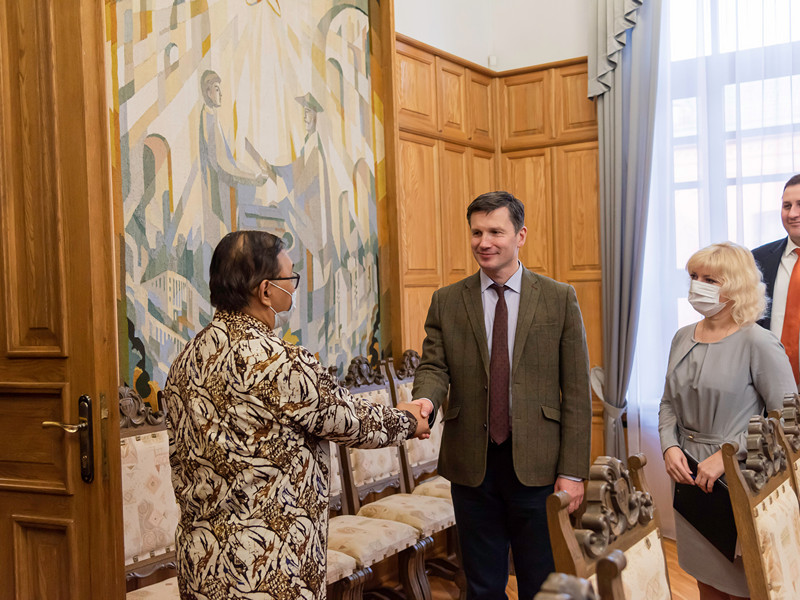 The Deputy Chief of Mission of the Republic of Indonesia to the Russian Federation and the Republic of Belarus Azis Nurwahyudi met with the BSU Rector Andrei Korol. The meeting was also attended by Konstantin Kozadaev, the Vice-rector of BSU for academic affairs and internationalization of education, Alexander Zhuk, the Head of the Department of Education and Science, Adi Priyanto, the Minister Counsellor, Adi Nuryanto, Attache of Education.
